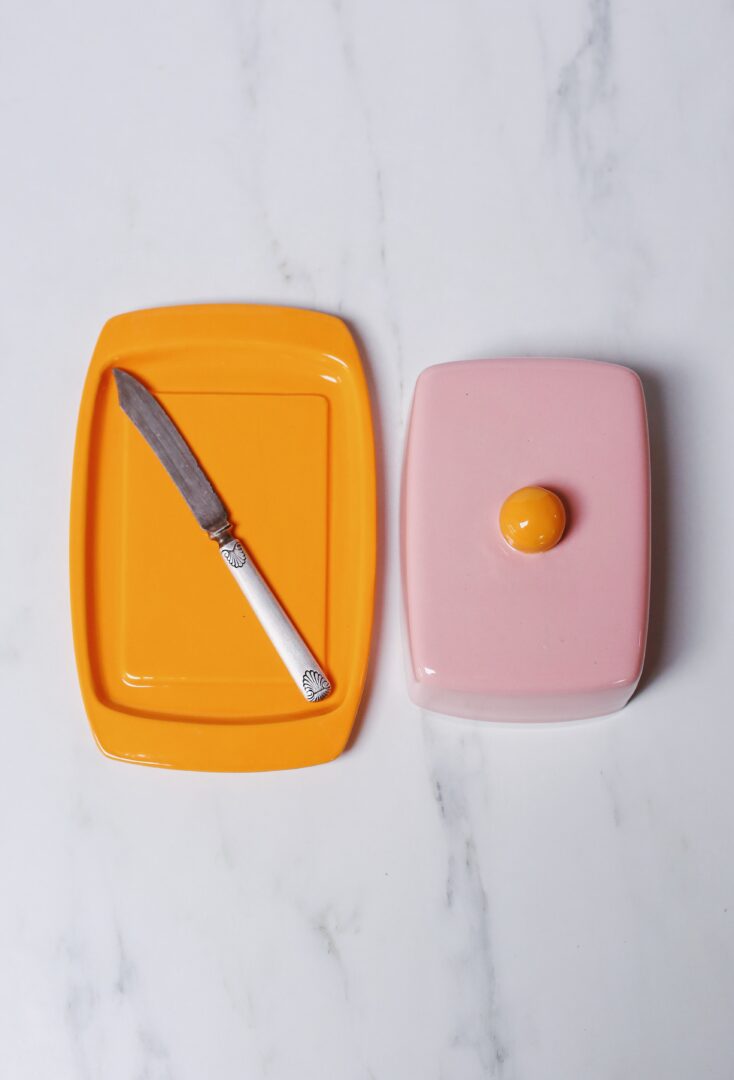 Ceramiczna maselnica w intensywnych różowym i pomarańczowym kolorze.Ręcznie malowana szkliwami bezpiecznymi do kontaktu z żywnością.