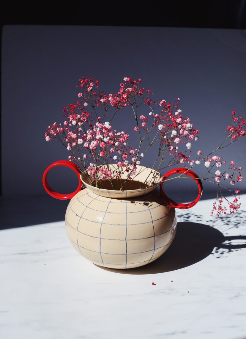 Ceramiczny wazon w kratkę i kwiatkowe uszy. Efektowny dodatek do wnętrza.
